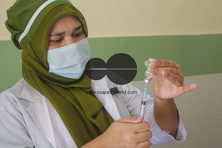 Medical staff prepare a syringe with a dose of the Oxford-AstraZeneca vaccine by the Serum Institute of India during the second phase of Covid-19 vaccination drive at Osmani Medical College and Hospital Vaccination Center which started on April 08th 2021. Sylhet, Bangladesh.