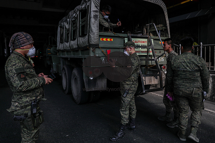 Soldiers wait for citizens to ride a military truck as a free transportation offered by the government to help citizens get to their destinations as public transport has been suspended under the community quarantine during the coronavirus lockdown in Mani
