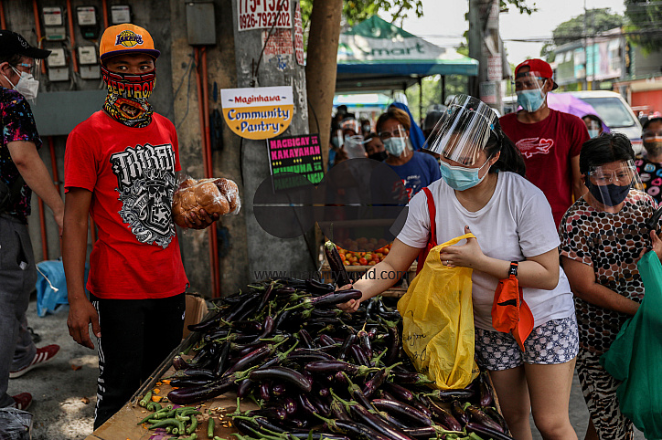 • Description: Residents wearing protective equipment collect free food and other goods at a community pantry in the Maginhawa neighborhood in Quezon City. Despite allegations by law enforcers as communist underground organizations that want to undermine the government, community pantries have sprouted across the country in the past week to help people affected by strict quarantine measures to curb the spread of the coronavirus disease. Metro Manila, Philippines.