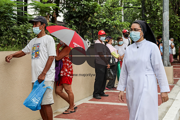• Description: Residents queue to collect free goods from a community quarantine offered by the Missionary Sisters of the Sacro Costato and of the Sorrowful Mother (MSC) in Quezon City. Church groups have expressed support to the growing number of community-run pantries providing free food to people affected by the COVID-19 pandemic despite allegations by law enforcers as communist rebels or supporters of the long-running leftist insurgency in the country. Metro Manila, Philippines.