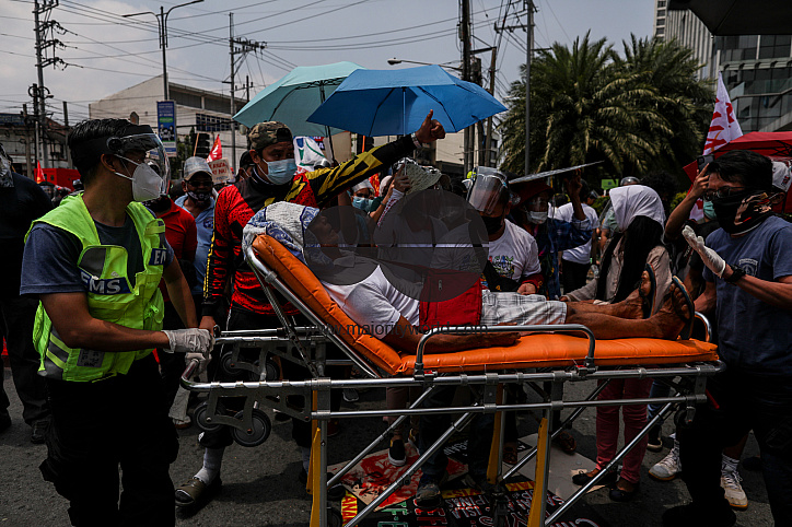 • Image Description: Members of the Quezon City Disaster Risk Reduction Management Office or QCDRRMO respond to a protester who went unconscious during a protes in celebration of Labor Day in Quezon City. Various groups called for adequate labor rights and benefits such as mi