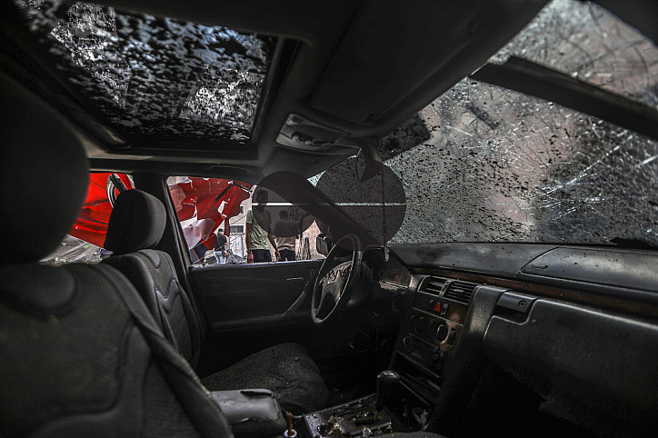 • Image Description: Damaged vehicles at the Palestinian Ministry of Health building and Al-Rimal dispensary, as a result of an Israeli airstrike on a target next to the ministry. Gaza City.