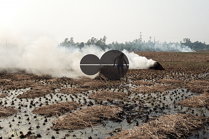Farmings burning hay after harvesting crops to prepare the land for the next round of cultivation. Cox'x Bazar, Chittagong, Bangladesh.