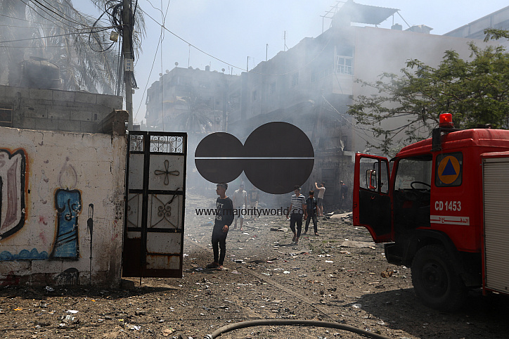 • Image Description: Smoke rises from a 14-story building as Israeli fighter jets continue to pound a Palestinian building called "Ash-Shuruq" at Omar Al-Mukhtar neighborhood. Gaza Strip.