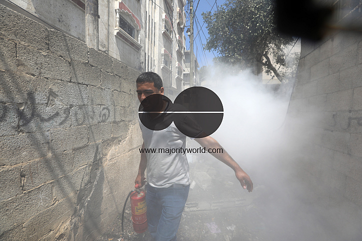 A person trying to douse the smoke rising from a 14-story building as Israeli fighter jets continue to pound a Palestinian building called "Ash-Shuruq" at Omar Al-Mukhtar neighborhood. Gaza Strip.
