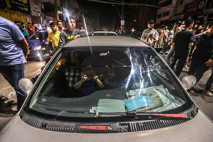 Gaza City. 21st May 2021. People take to the streets to celebrate following a ceasefire brokered by Egypt between Israel and the ruling Islamist movement Hamas in the Gaza Strip.