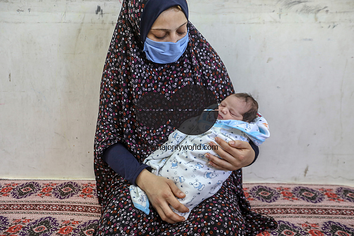 A Palestinian woman bearing a one-day-old baby at a United Nations school where many displaced Palestinian families have sought refuge amid air strikes and bombardment by Israeli forces. Gaza City.