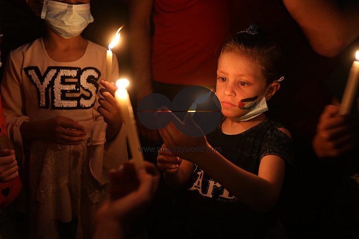 Gaza City. 23rd May 2021. Palestinian children light candles in the rubble of the house of a family whose children were all killed in an Israeli raid in the Shati refugee camp, west of Gaza City.