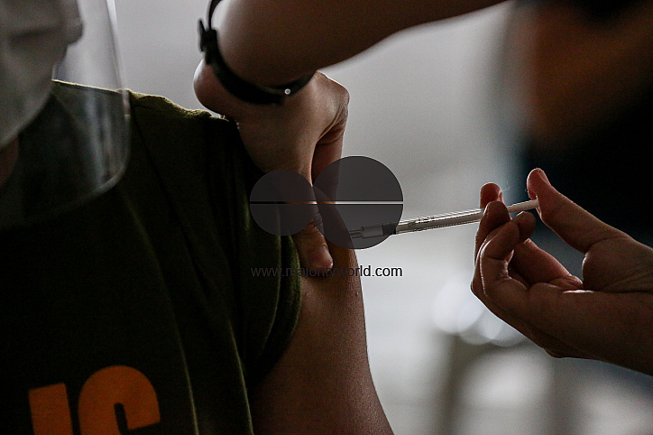 • Image Description: A policeman receives a dose of the Sinovac COVID-19 vaccine during a vaccination program inside a sports stadium in Marikina City, east of Manila, Philippines.