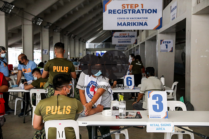 A volunteer nurse checks the blood pressure of a policeman upon receiving dose of the Sinovac COVID-19 vaccine during an inoculation program inside a sports stadium in Marikina City, east of Manila, Philippines.
