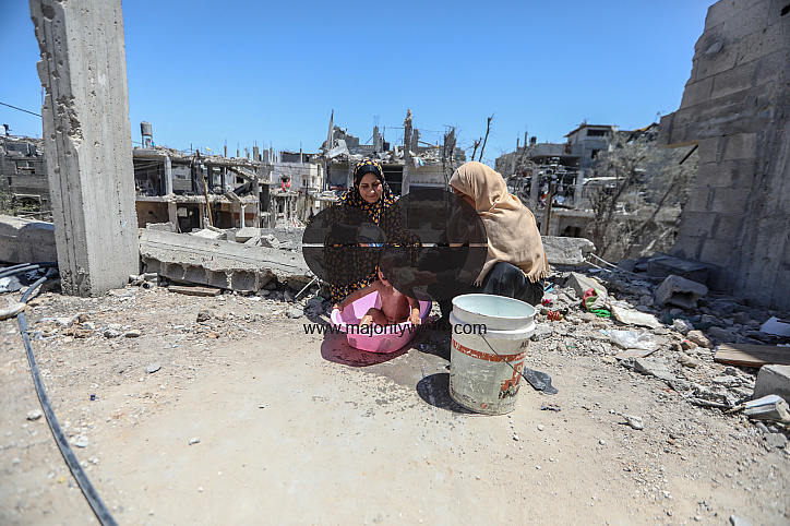 Gaza City. 27th May 2021. The mother of the Palestinian child, Imad Naseer, bathes her child in a plastic container on the rubble of her destroyed home in Beit Hanoun. Residents of Beit Hanoun suffer from the lack of water and electricity in the area due