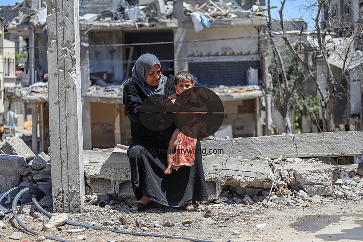 • Image Description: Gaza City. 27th May 2021. The mother of the Palestinian child, Imad Naseer, bathes her child in a plastic container on the rubble of her destroyed home in Beit Hanoun. Residents of Beit Hanoun suffer from the lack of water and electricity in the area due
