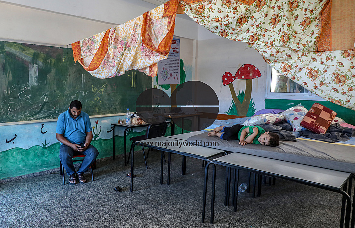 • Image Description: Palestinian families live in the UNRWA school because their homes were completely destroyed during the Israeli aggression on Gaza. Gaza City.