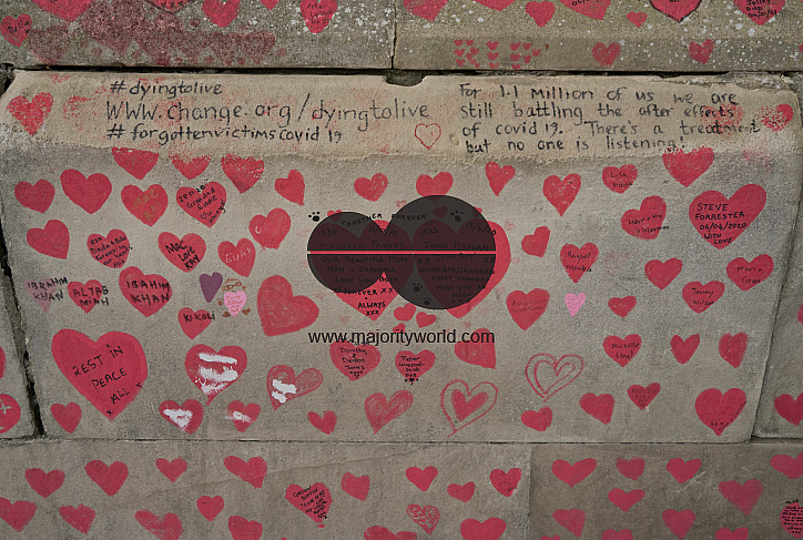 The National Covid Memorial Wall, a public mural painted by volunteers to commemorate victims of the COVID-19 pandemic in the United Kingdom. It is on the South Bank of the River Thames in London, opposite the Palace of Westminster, London, England, UK.