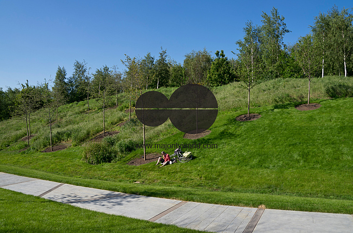 View of the London Blossom Garden, at the Queen Elizabeth Olympic Park, a living memorial to commemorate the city's shared experience of the Coronavirus pandemic. The garden offers a place of reflection for Londoners to remember those who have lost their lives, and pays tribute to Londonâs brave key workers who risked their own lives to help others and keep the city moving, London, England, UK.