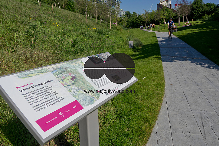 View of the London Blossom Garden, at the Queen Elizabeth Olympic Park, a living memorial to commemorate the city's shared experience of the Coronavirus pandemic. The garden offers a place of reflection for Londoners to remember those who have lost their lives, and pays tribute to Londonâs brave key workers who risked their own lives to help others and keep the city moving, London, England, UK.