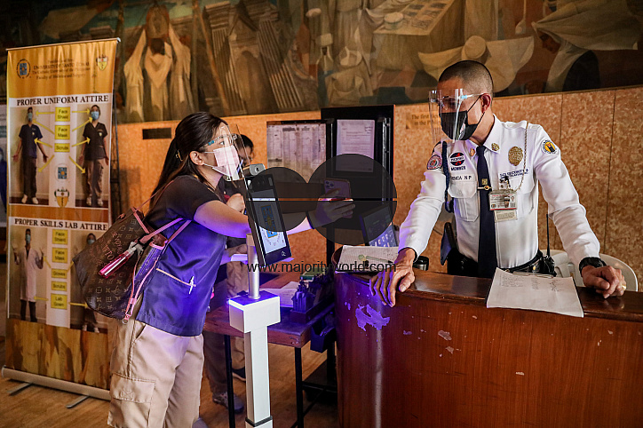 Manila, Philippines. June 10th 2021. A medical student wearing a protective mask as precaution against COVID-19 shows her health online decalaration form as students attend a face-to-face class at the University of Santo Tomas. The university started its