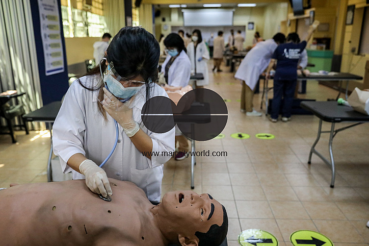 • Description: Manila, Philippines. June 10th 2021. Medical students perform a clinical skills exercise on an electronic dummy during a face-to-face class at the University of Santo Tomas. The university started its limited face-to-face classes after the government allowed the resumption hands-on training and laboratory classes in campuses while observing health protocols to prevent the spread of the coronavirus disease.