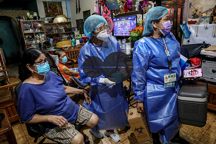 Medical workers prepare to inoculate Rodolfo Rosos and his wife Erlinda Rosos, both 72, with the Sinovac COVID-19 vaccine inside their home. The national government has expanded its COVID-19 vaccination rollout nationwide to those under the A4 category that covers essential workers, frontliners in national government offices, and uniformed personnel. Manila, Philippines.