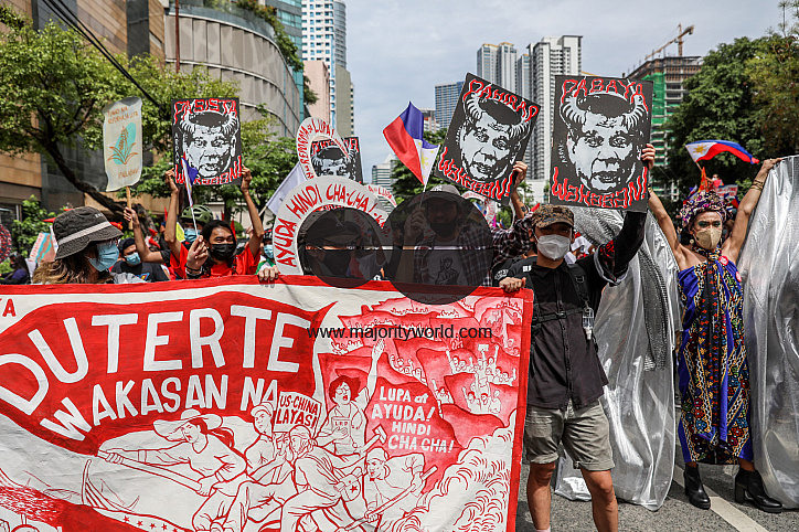 • Image Description: Metro Manila, Philippines. 12th June 2021. Activists shout slogans during a protest in front of the Chinese consulate marking Independence Day in the financial district of Makati. Various groups called on China to stop its maritime activities in the dispu