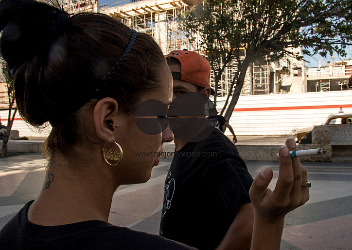 A boy and a girl having a chat while skating on the street. Skateboarding in Cuba and the issue of its practice in the country. Cuba.