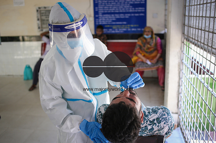A medical officer wearing protective suit and collecting sample for COVID-19 testing at the Sylhet Doctor Shahid Shamsuddin Ahmed Hospital, Bangladesh.