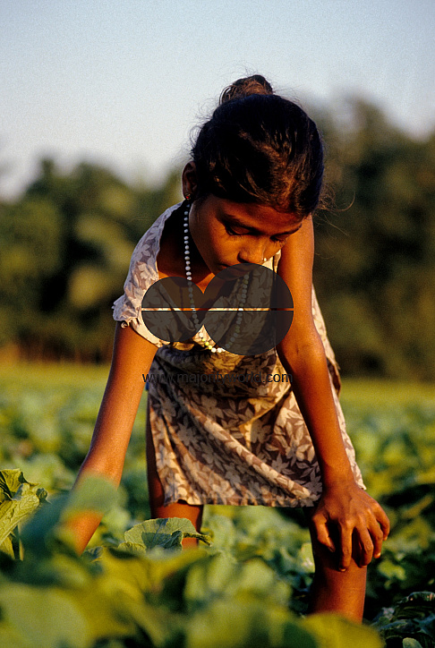 It is common for rural children to help their parents in the field. It is not seen as child labour, but as a way in which they can become productive members of the family and learn agricultural methods. A girl tends their vegetable patch. Norshingdi. Bangladesh.