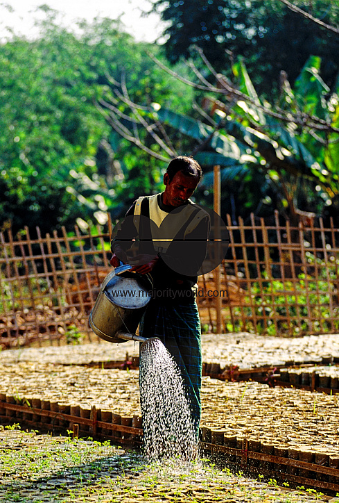 The Synergy Foundation, a Dutch NGO, plants trees through a programme of shared equity between land owners, workers and the foundation. Man watering a nursery near Chittagong. Bangladesh.