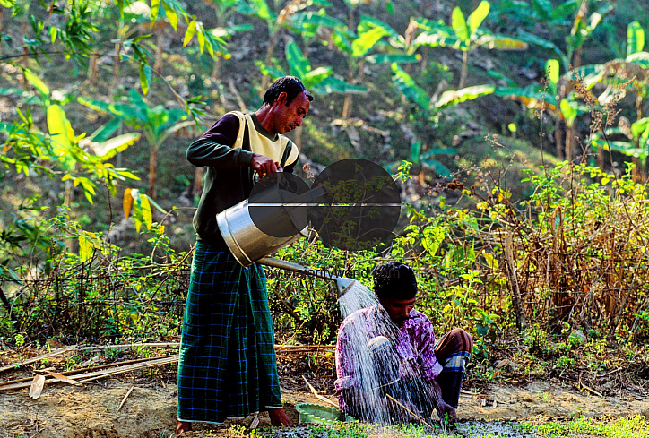 The Synergy Foundation, a Dutch NGO, plants trees through a programme of shared equity between land owners, workers and the foundation. Man watering a nursery near Chittagong. Bangladesh.