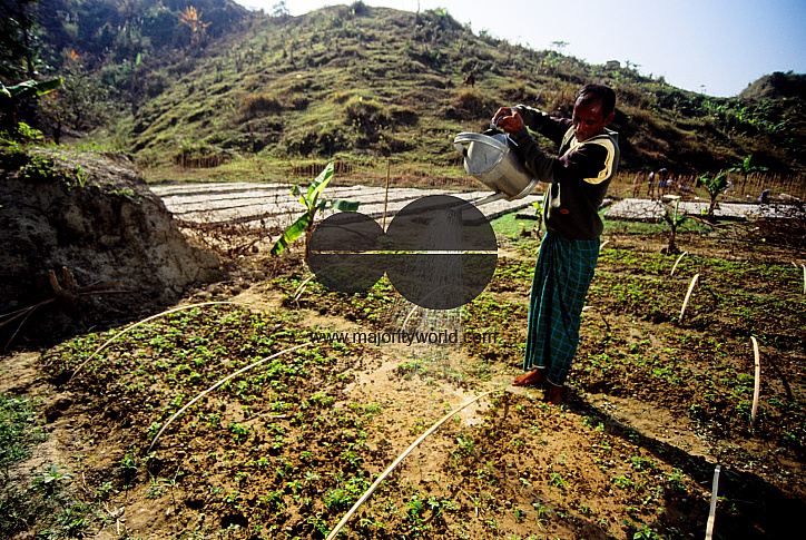 The Synergy Foundation, a Dutch NGO, plants trees through a programme of shared equity between land owners, workers and the foundation. Man watering a nursery near Chittagong. Bangladesh.