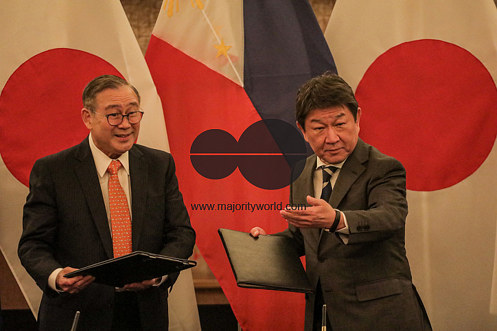 Philippine Foreign Affairs Secretary Teodoro Locsin, Jr., left, exchanges agreements with his Japanese counterpart Toshimitsu Motegi after their bilateral meeting in Manila, Philippines.
