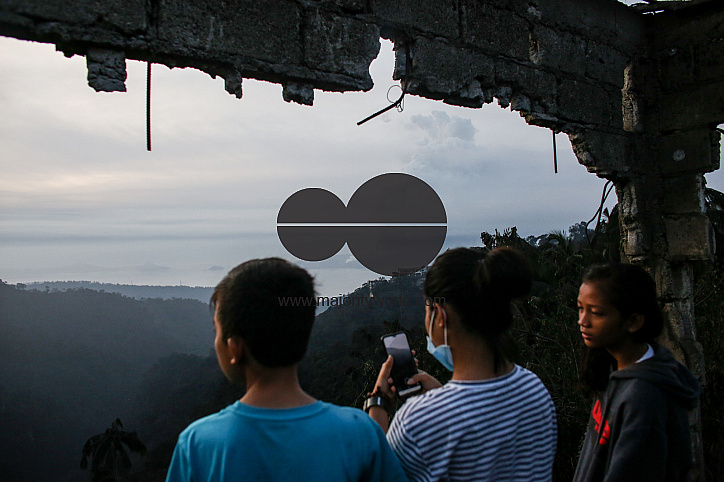Children look at Taal volcano releasing smoke and ash during an eruption in Tagaytay, Cavite province south of Manila. Taal Volcano is a large caldera filled by Taal Lake in the Philippines. Located in the province of Batangas, the volcano is one of the m
