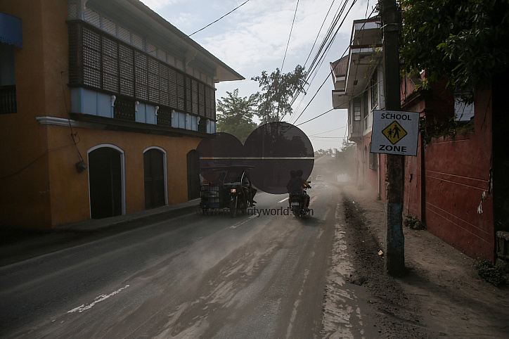 Vehicles on a street covered in volcanic ash in the town of Taal in Batangas province. Taal Volcano is a large caldera filled by Taal Lake in the Philippines. Located in the province of Batangas, the volcano is one of the most active volcanoes in the coun
