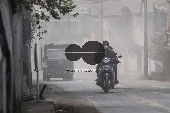 Vehicles on a street covered in volcanic ash in the town of Taal in Batangas province. Taal Volcano is a large caldera filled by Taal Lake in the Philippines. Located in the province of Batangas, the volcano is one of the most active volcanoes in the coun