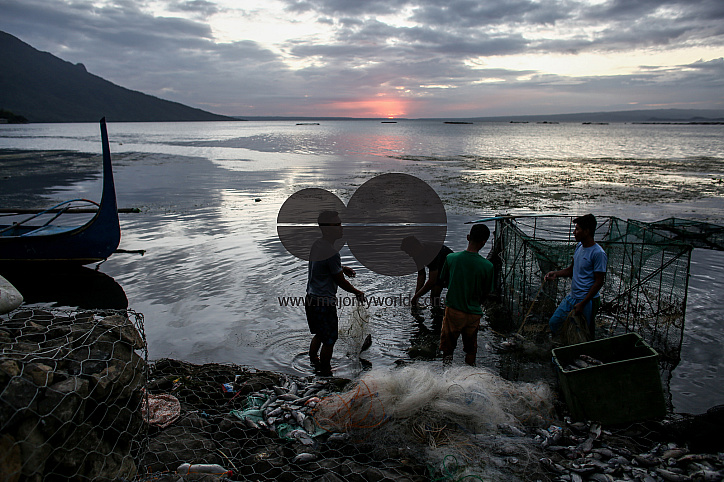 Fisherman harvests thier catch along the lakeshore amid the Taal volcano eruptions in Talisay town in the province of Batangas south of Manila. Taal Volcano is a large caldera filled by Taal Lake in the Philippines. Located in the province of Batangas, th