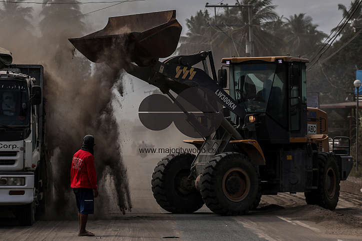 Workers clear a road covered in thick ash during an ash fall caused by the Taal volcano eruption in Batangas province, south of Manila. Located in the province of Batangas, the volcano is one of the most active volcanoes in the country, with 34 recorded historical eruptions, all of which were concentrated on Volcano Island, near the middle of Taal Lake. The last eruption was on January 12, 2020. Philippines.