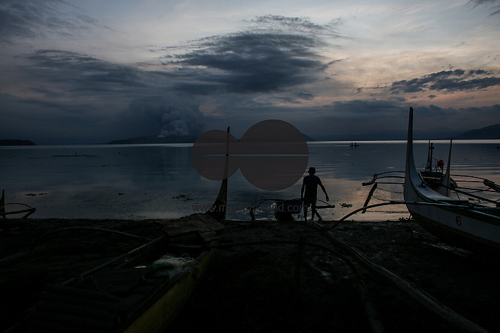 Fisherman at work near the Taal volcano island in Batangas province south of Manila. Located in the province of Batangas, the volcano is one of the most active volcanoes in the country, with 34 recorded historical eruptions, all of which were concentrate