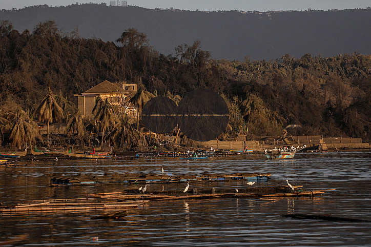 Damaged houses and trees are seen covered in volcanic ash following the eruption of Taal volcano in Batangas province south of Manila, Philippines. Taal Volcano is a large caldera filled by Taal Lake in the Philippines. Located in the province of Batangas, the volcano is one of the most active volcanoes in the country, with 34 recorded historical eruptions, all of which were concentrated on Volcano Island, near the middle of Taal Lake. The last eruption was on January 12, 2020. Philippines.