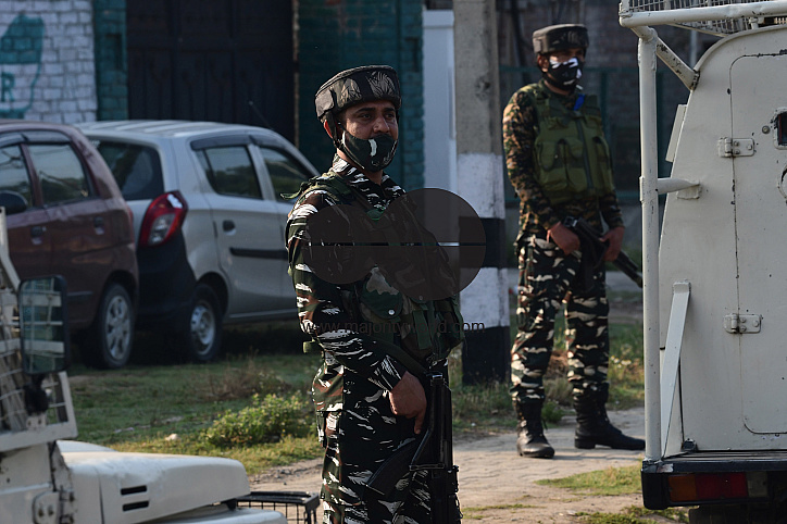 Srinagar. 16th July 2021. Security Forces near in an encounter between militants and security forces at Alamdar colony in the Danmar Eidgah area. Srinagar.