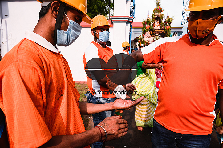 The Ratha Yatra festival was celebrated inside the temple in Tehatta, in accordance with the administration rules for precautions against the coronavirus. They were not allowed to enter without masks. A voluntary organization helped with sanitizer for the devotees. Although there were rules, some children and elders did not wear masks or were not wearing the masks properly. Tehatta, West Bengal; India.