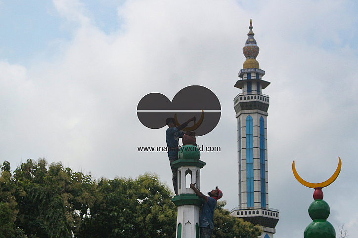 • Description: Workers paint the minaret of the gate of the Central Shahi Eidgah Moidan, in preparation for the Eid-ul-Azha prayers, the biggest religious festival for Muslims. Sylhet, Bangladesh.