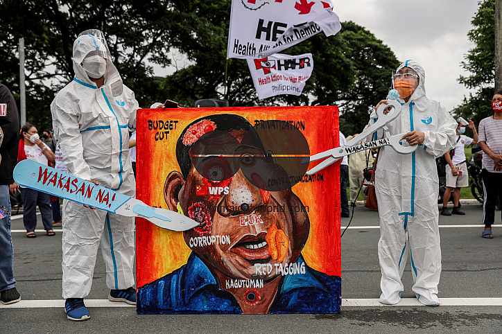 • Description: Protesters wearing protective gear with banners ahead of President Rodrigo Duterte's last state of the nation address in Quezon City, Metro Manila. Thousands of left-wing protesters gathered and marched toward the Philippine Congress where Duterte delivered his final state of the nation speech, winding down his six-year term amidst criticisms such as alleged human rights violations, mishandling of the coronavirus pandemic and inaction to confront China’s aggressive behavior in the disputed South China Sea. Philippines.