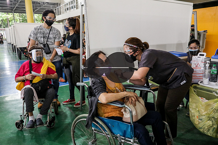 Medical workers inoculate persons with disabilities with the Johnson & Johnson COVID-19 vaccine at the Filoil Flying-V Arena in San Juan City. Philippine officials said a local transmission of the highly contagious delta variant of the COVID-19 virus has been detected in the country and announced tighter quarantine restrictions in the capital and a ban on the entry of travelers from hard-hit Malaysia and Thailand. Metro Manila, Philippines.