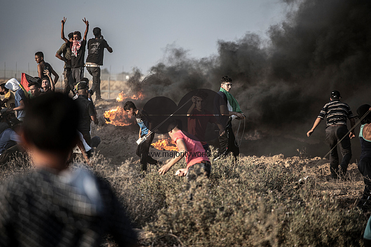 Palestinian demonstrators participate during a demonstration near the border between Israel and the Gaza Strip. A march organized by Palestinian factions on the border between the Gaza Strip and Israel in protest against the continuation of the siege impo