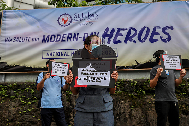 • Image Description: Metro Manila, Philippines. 30th August 2021. Healthcare workers carry signs during a protest to mark National Heroes Day outside the St. Luke's Medical Center in Quezon City. The group called on the government to release funds for benefits and adequate pr