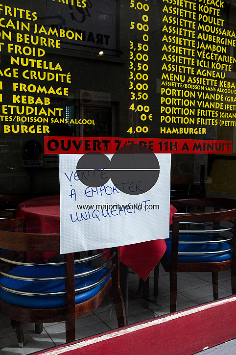 Coronavirus messages and safety measures at supermarkets, shops, restaurants, bars, cafes, pubs and other locations across the country. France.