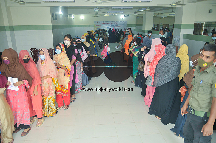 • Image Description: Women stand in a long queue to receive the COVID-19 Vaccine at the M A G Osmani medical college & hospital vaccination center. Sylhet, Bangladesh.
