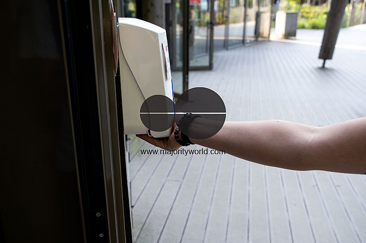Sanitizer unit. Safety measures and health guidelines have been maintained at supermarkets, shops, restaurants, bars, cafes, pubs and other locations across the country. France.