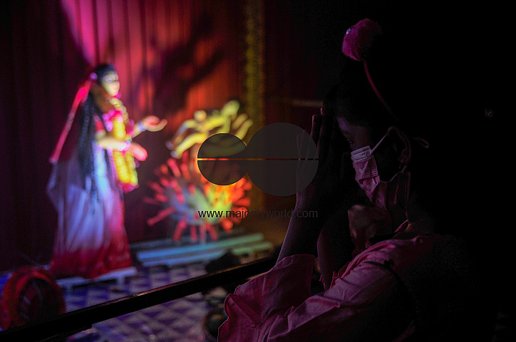Sylhet, Bangladesh. 13th October 2021. A devotee is worshiping the idol of Durga. The main religious festival of the followers of traditional Hindu religion is 'Durga Puja Utsav'.