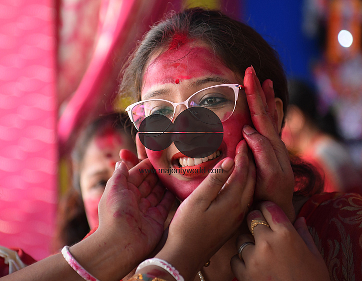 Married women devotees apply vermilion powder on each other and dance as part of a traditional ritual, SIDUR KHELA, on the last day of the Durga Puja, called Dashami (Dasara). Agartala, Tripura, India.